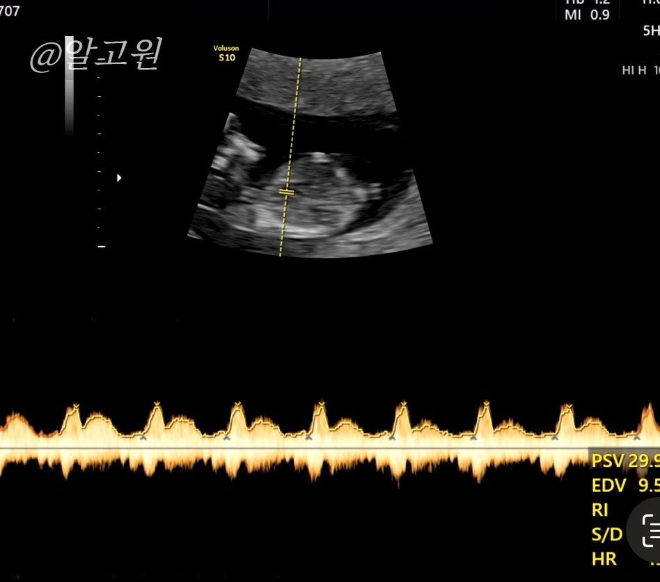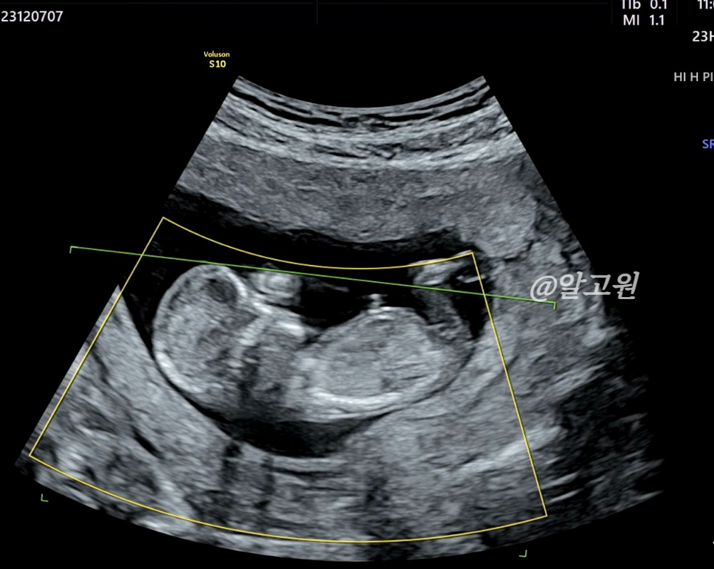 초음파로 목투명대, 척추와 뼈, 장기, 뇌 모양, 심장박동소리, 태반 위치 등