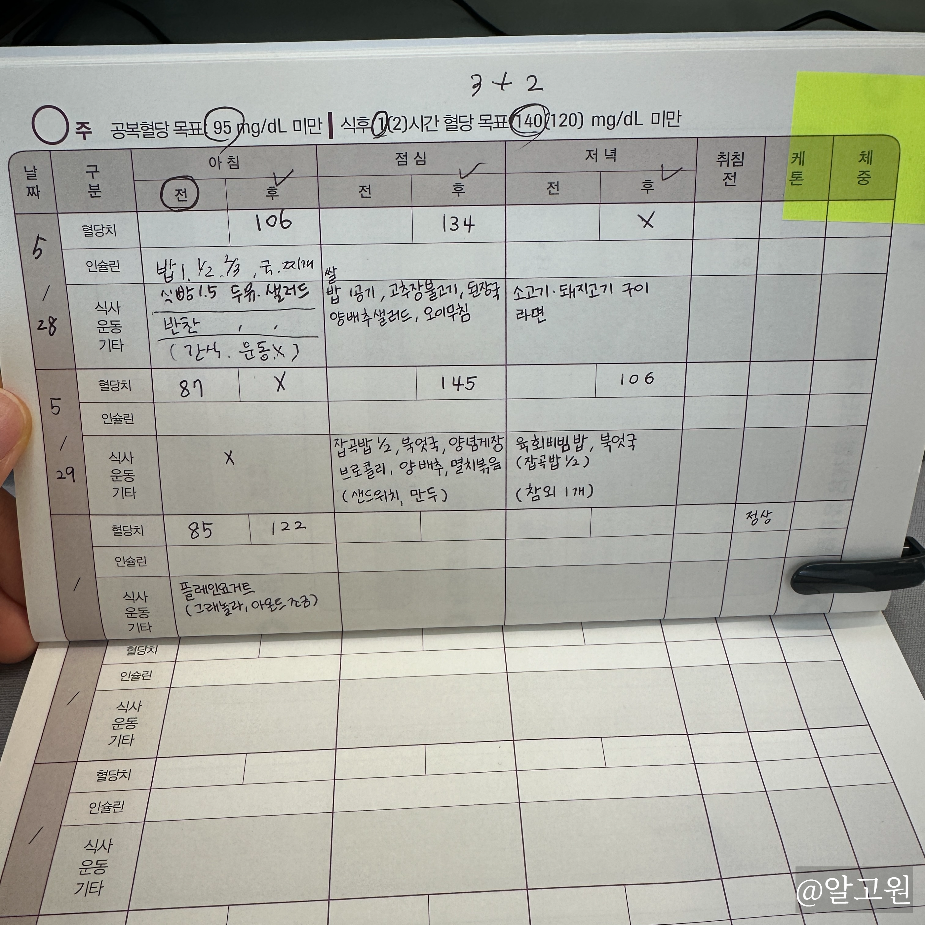 | - 일주일 뒤 내원 必, 출산때까지 2주에 1번 내원 - 매일 4회 혈당체크 - 매일 3회 식사 기록 - 매일 2회 간식 기록 (공복시간 길어지면 안됨) - 매일 아침 소변검사로 케톤 수치 검사 - 분만 2개월 후 당뇨정밀검사 |