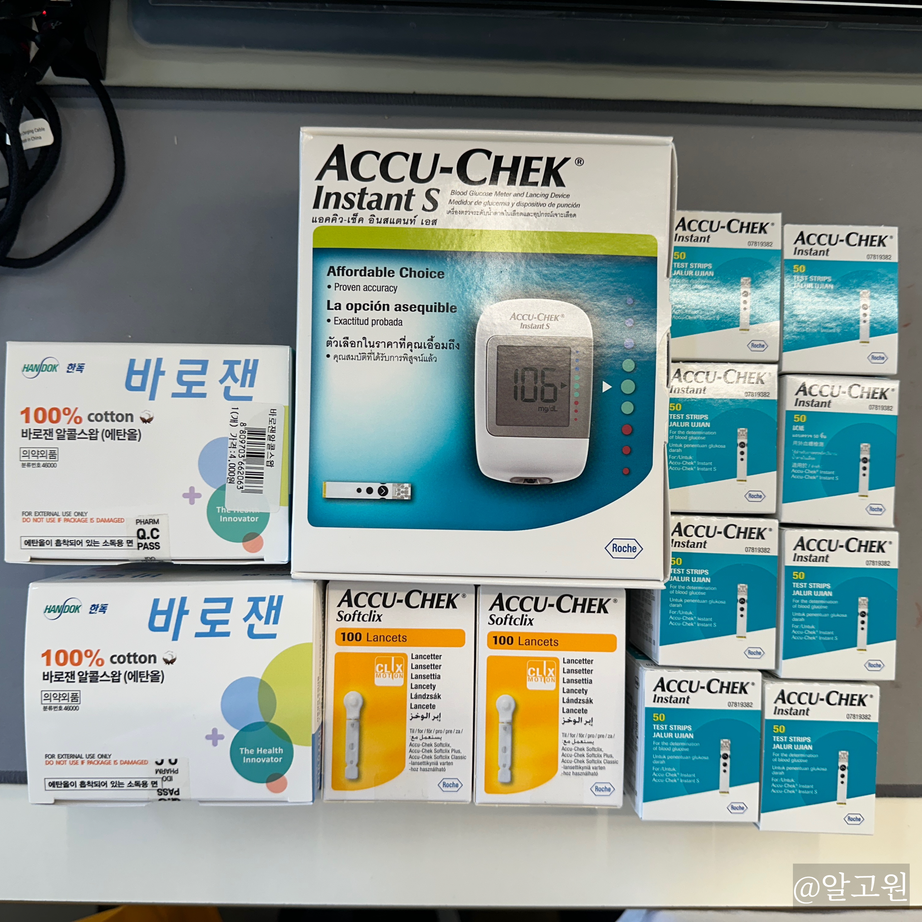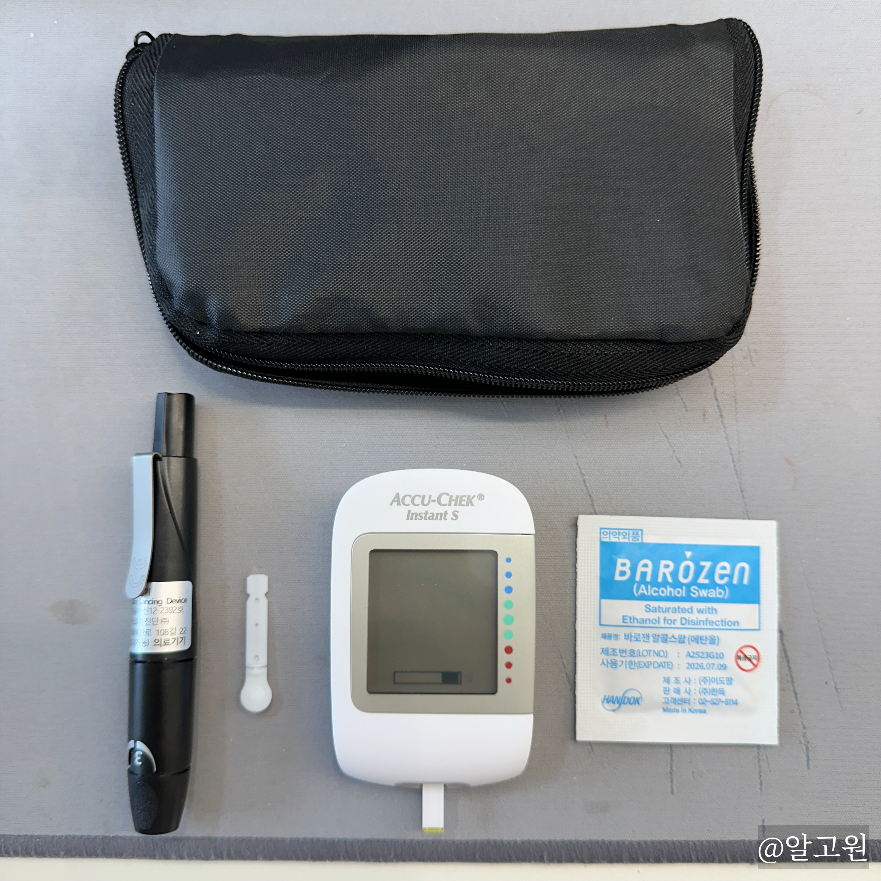 오른쪽 사진은 매일 혈당체크 해야하는 준비물 이에요.
